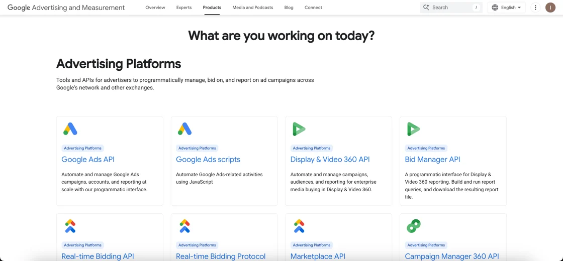 Everything you need to build, automate, and scale Google ads is now in one clean, centralized place. Think Google Ads API, Google Analytics, AdMob, Google Ad Manager, tagging tools, and measurement resources — all neatly organized.